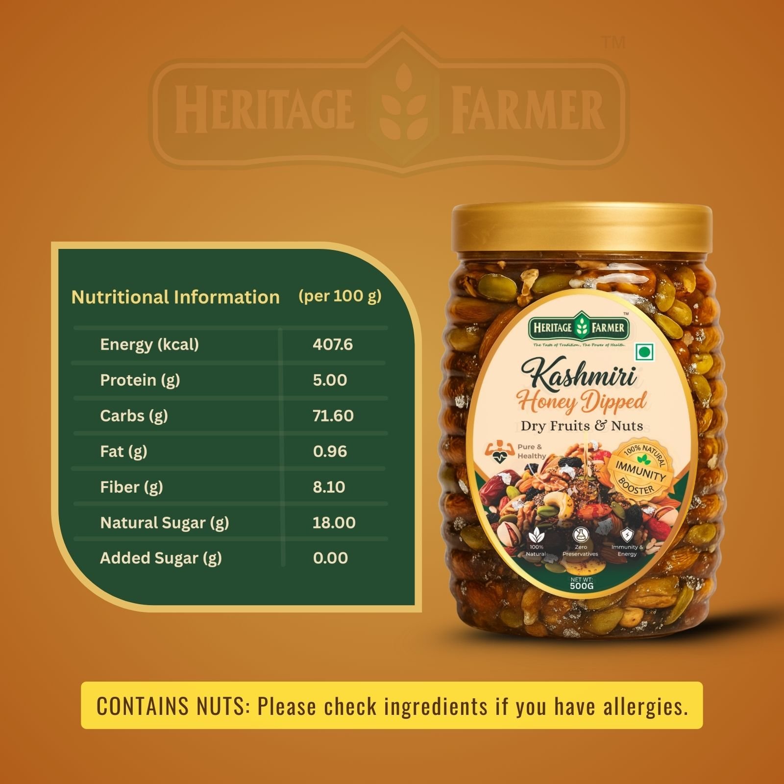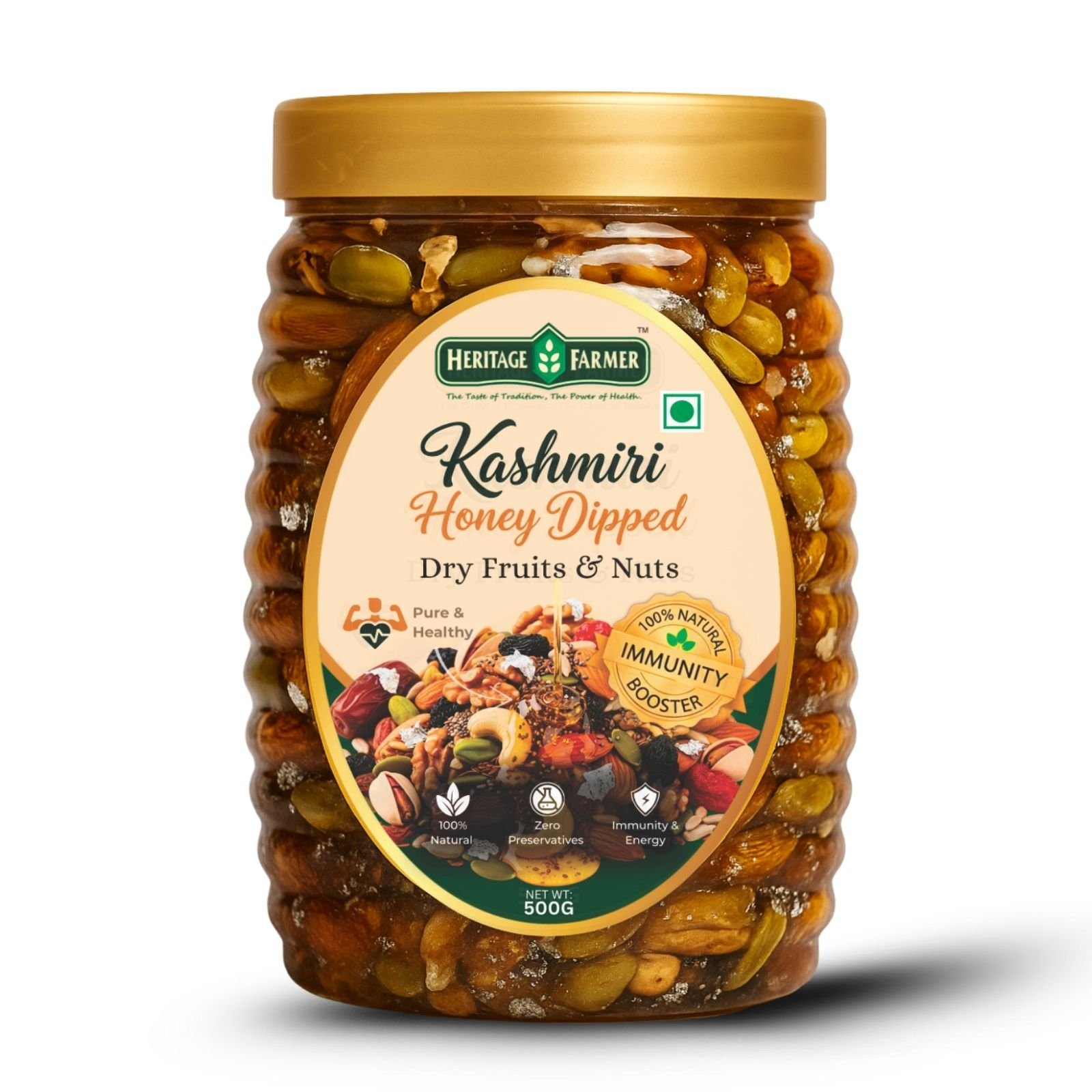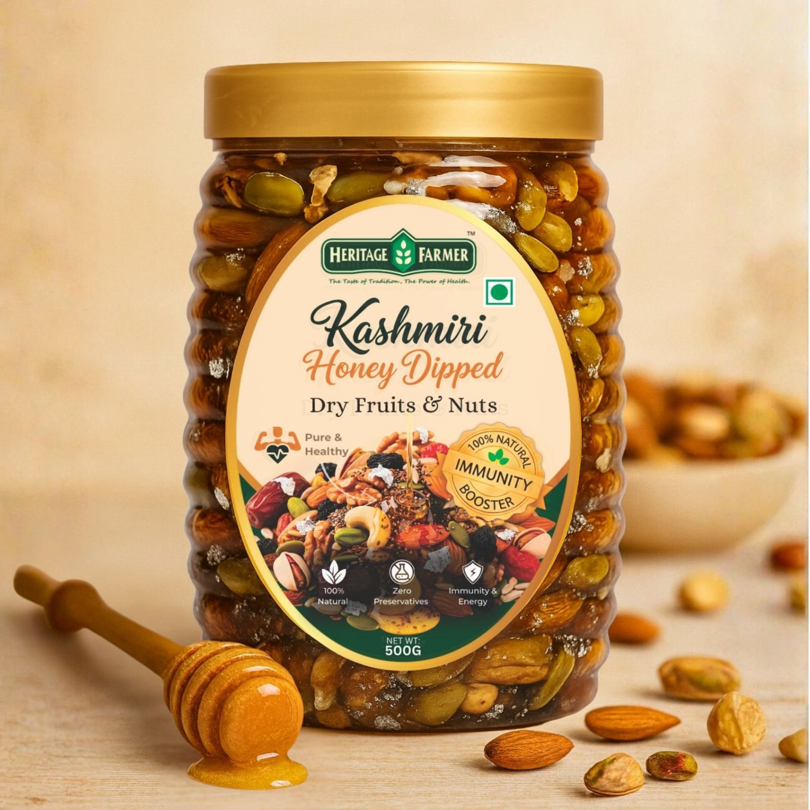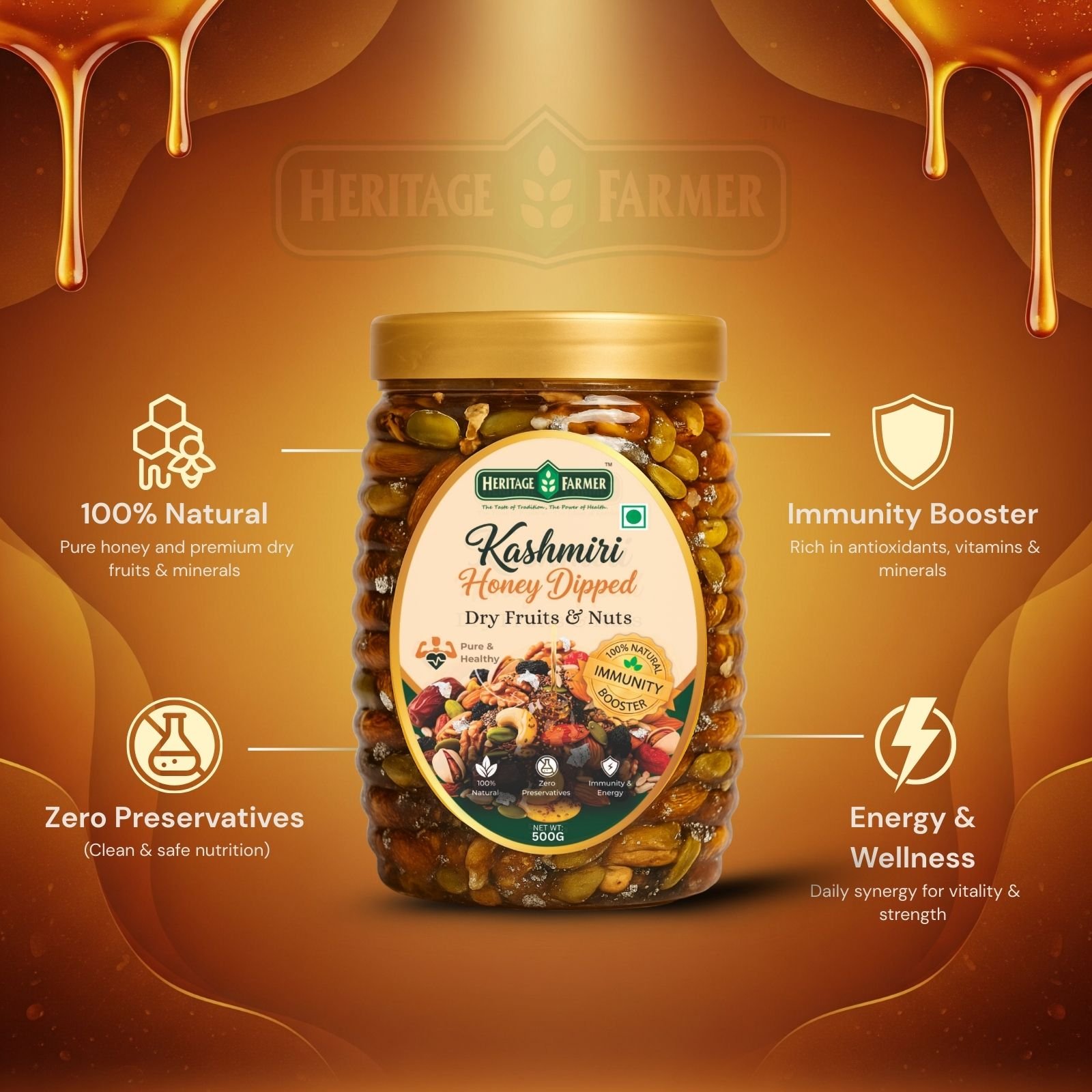 Heritage Farmer Kashmiri Honey Dipped Dry Fruits & Nuts is a thoughtfully crafted superfood made with handpicked almonds, cashews, walnuts, seeds, and dried fruits, soaked in pure, natural honey. This traditional combination delivers sustained energy, supports immunity, and provides essential nutrients without any added sugar or preservatives.